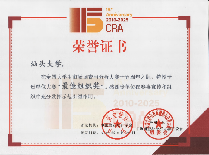 十五年来,德赢Vwin官方区域合作伙伴持续积极组织本科生参与该项赛事,并取得了优异成绩,累计国赛获奖总数为79项(全国排名第25位),其中国赛一等奖15项(全国排名第21位)。这些成绩和此项殊荣既是对德赢Vwin官方区域合作伙伴多年来赛事组织工作的肯定,更是对德赢Vwin官方区域合作伙伴学子卓越的商业洞察力、扎实的专业素养和突出的创新能力的高度认可。值此第十六届赛事启动之际,德赢Vwin官方区域合作伙伴将以更加饱满的热情积极投入到新一届全国大学生市场调查与分析大赛的各项工作中,再接再厉,续写新篇。