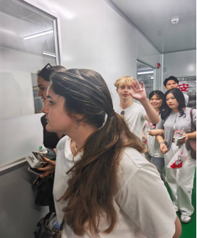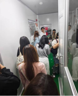随后,师生一行参观了生产车间,近距离了解GMP万级无菌净化车间与自动化生产线的运作模式。学生们还深入了解了企业在质量管控与标准化生产方面的先进实践,期间不断为我国食品产业的发展水平与严谨流程赞叹不已。泰国学生感慨地说:“中国企业在泰国积累的成功经验,为我未来的职业发展提供了极具价值的借鉴与启发。我期望在汕大这个巨大的平台中,通过不断提升自身的专业素养和综合能力,成为推动中泰经贸合作的重要桥梁。”