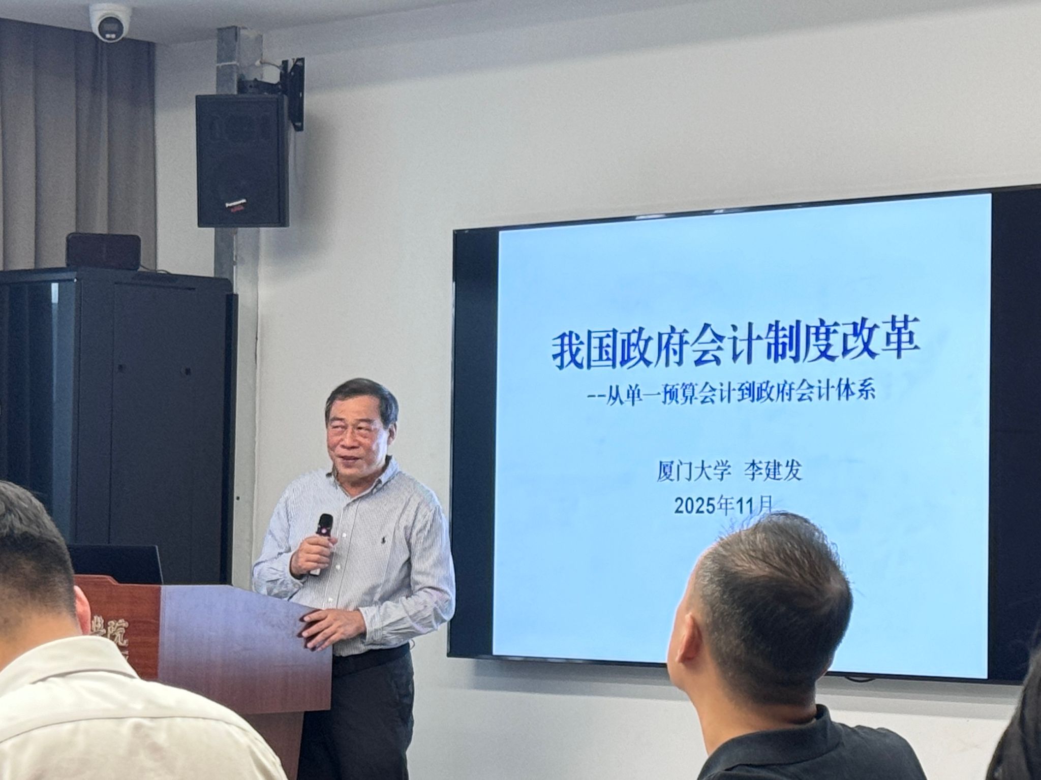 聘任仪式后,备受期待的汕大MPAcc大讲堂第一讲正式启幕,大讲堂由会计与财务系林斌教授主持。李建发教授以“我国政府会计改革”为题,娓娓道来,系统梳理了我国政府会计的演进脉络与改革逻辑,为同学们理解公共部门会计体系提供了清晰的框架。随后,杜兴强教授则以“会计文献之外”为主题,引领同学们跳出传统学术视野,探寻会计学与更广阔社会经济文化领域的交叉与融合,极大地激发了大家的创新思维。两场讲座一纵一横,既有对改革路径的纵深解读,也有对学科边界的前沿探索,为在场师生带来一场思想盛宴,现场互动热烈,掌声不断。