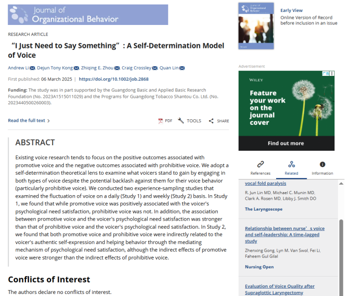 Li, A. , Kong D. T., Zhou, Z. E., Crossley, C. D., & Lin, Q.*, 2025. “I Just Need to Say Something”: A Self-Determination Model of Voice. Journal of Organizational Behavior. (DOI: https://doi.org/10.1002/job.2868, *通讯作者)