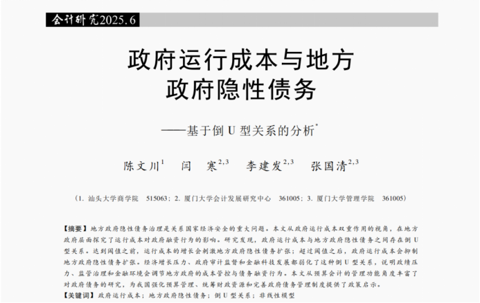 近日,德赢官网陈文川副教授作为第一作者撰写的论文《政府运行成本与地方政府隐性债务》正式发表在德赢Vwin官方区域合作伙伴人文社会科学一级学科首选期刊《会计研究》(2025年第6期)。